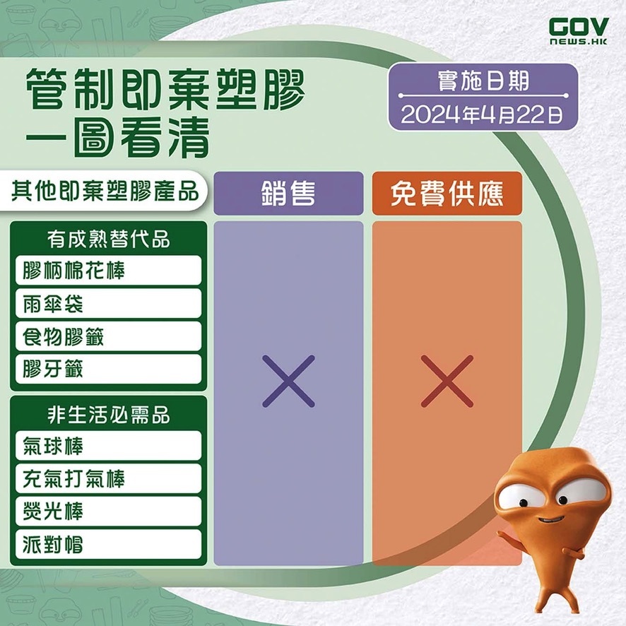 除咗餐具之外,一啲其他即棄塑膠產品都受到管制。塑膠棉花棒、熒光棒、雨傘袋等都已禁止銷售同免費供應。酒店禁止免費供應即棄洗漱梳妝用品 以及即棄膠樽裝水。